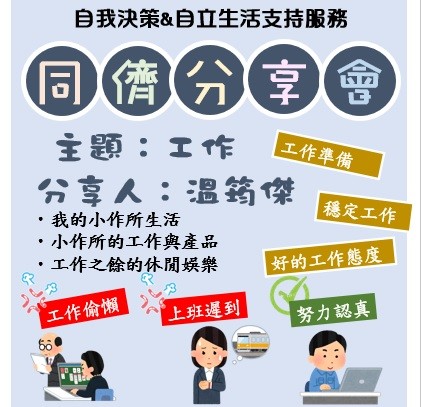 聽聽自立青年,從自身工作經驗, 分享從工作準備、穩定工作和工作態度的心得! 日期:111/08/25 (四) 18:30-20:30 地點:身障社區日照中心-中正據點 (新竹市中正路96巷16號2F)或以Google meet視訊參與 報名請來電:03-5626684羅社工、王社工